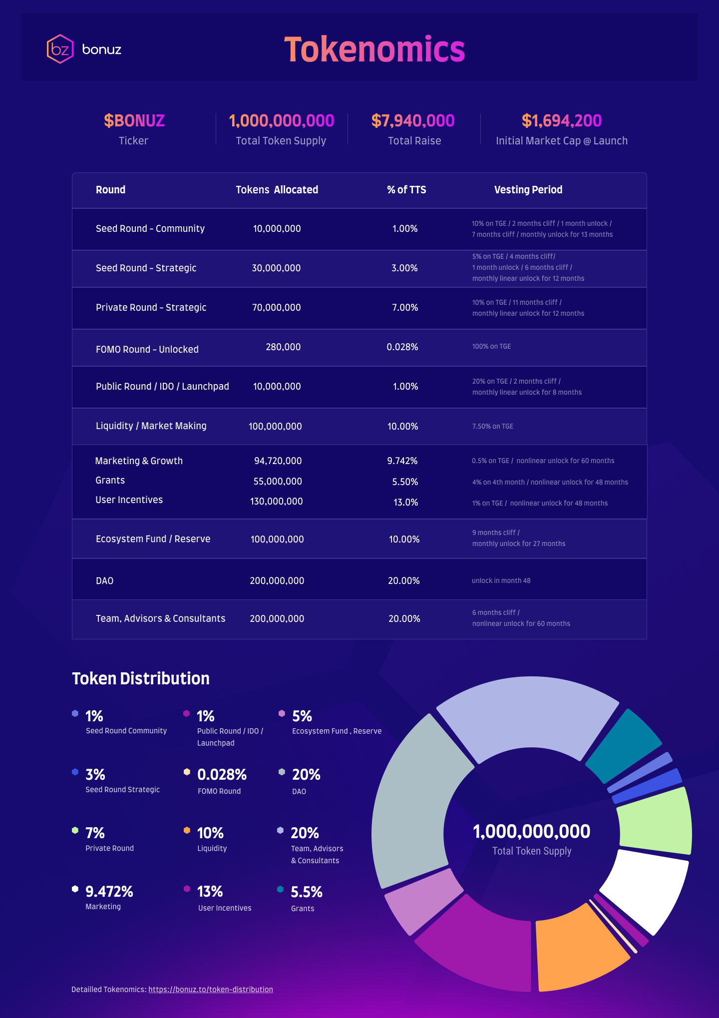 **Total Token Supply:** 1,000,000,000 $BONUZ **Total Raise:** $7,940,000 **Initial Market Cap at Launch:** $1,694,200